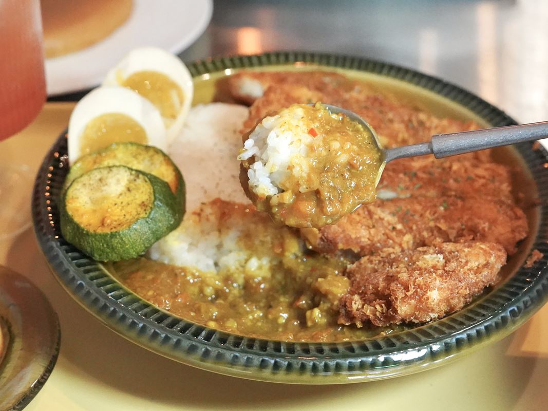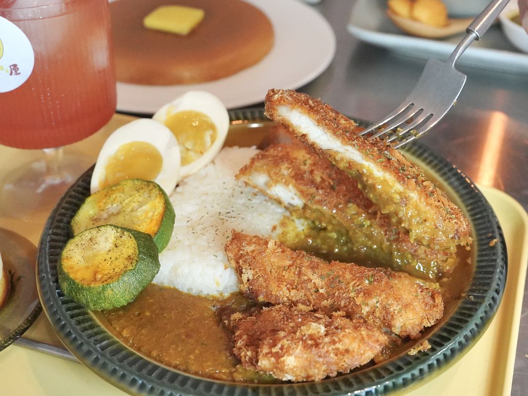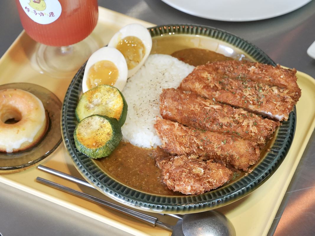 豬排外層酥脆卻不油膩,搭配咖哩醬一起享用讓人一口接一口,份量給的蠻足的。附的溏心蛋和櫛瓜也好吃。
