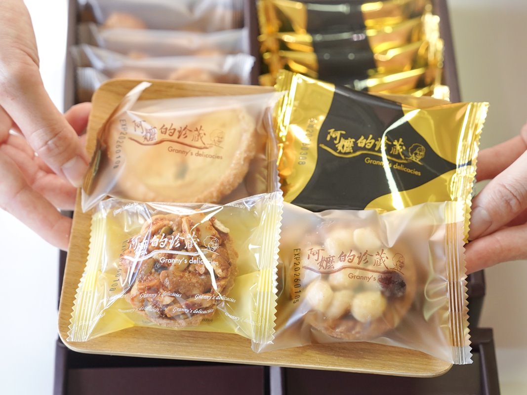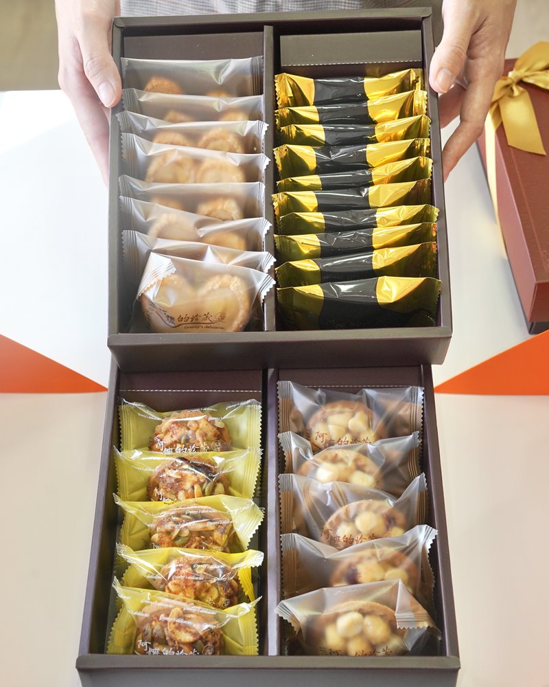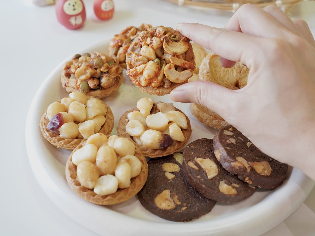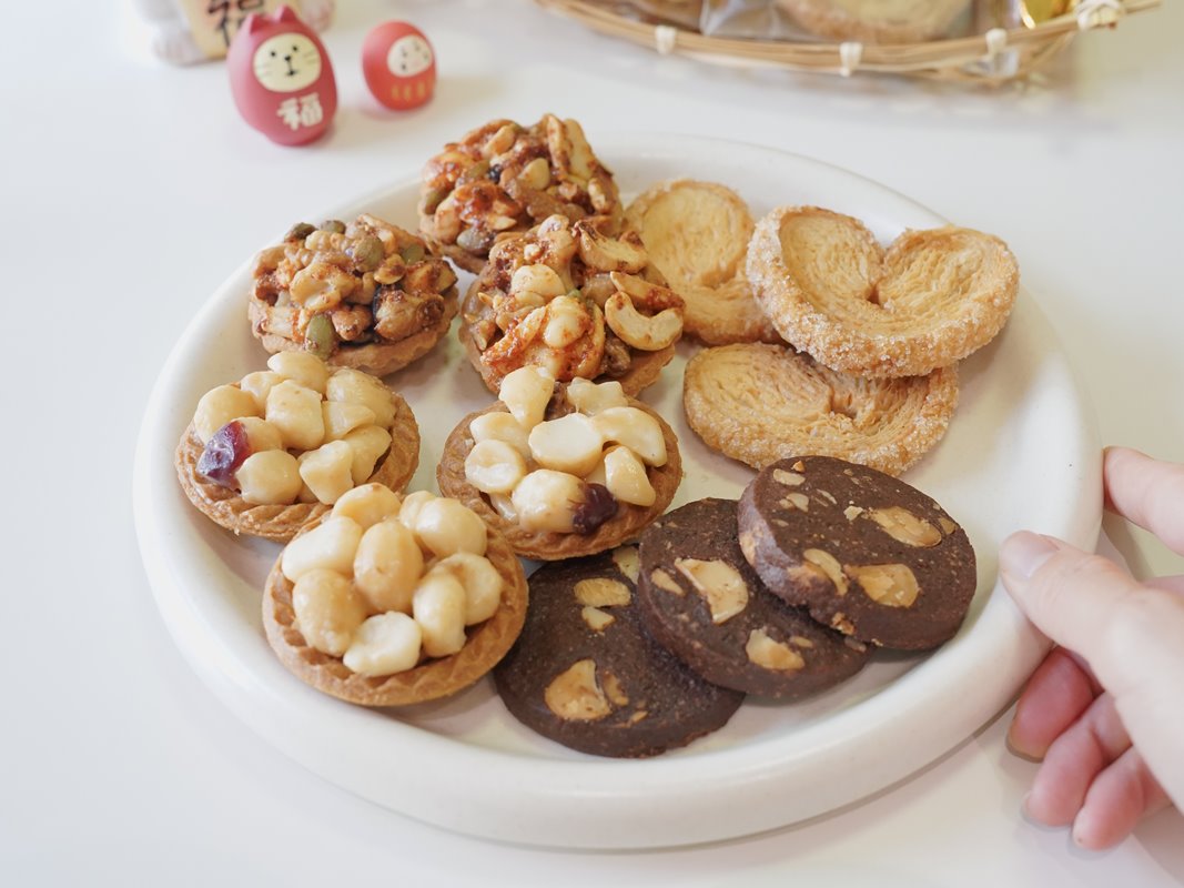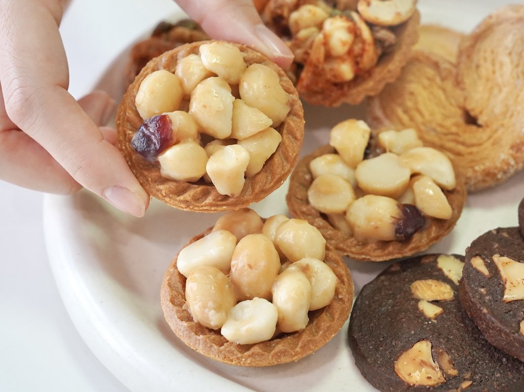包含:法式蝴蝶酥、夏威夷豆黑巧餅、天堂果氧身堅果塔 、夏威夷豆塔 人氣品項一次滿足。