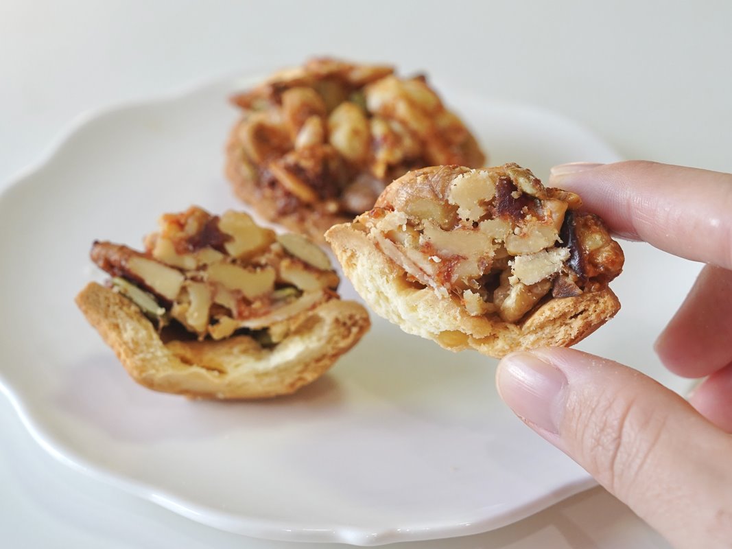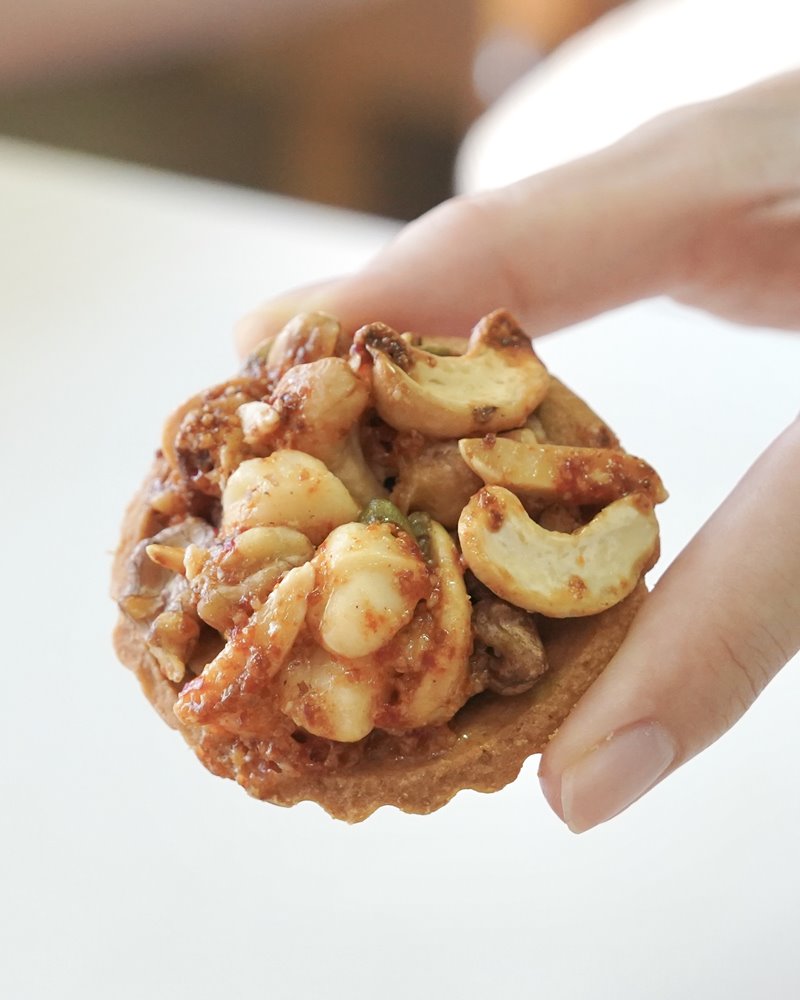 天堂果氧身堅果塔 餡料很滿,加了超特別的木鱉果假種皮、夏威夷豆、南瓜子、帕馬森起司,微鹹滋味越吃越涮嘴,香氣十足口感豐富。