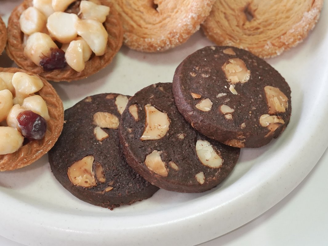 夏威夷豆黑巧餅 之前吃過就很喜歡!無糖可可粉濃郁苦甜,搭配夏威夷豆,餅乾是有厚度的,大口咬下很滿足。