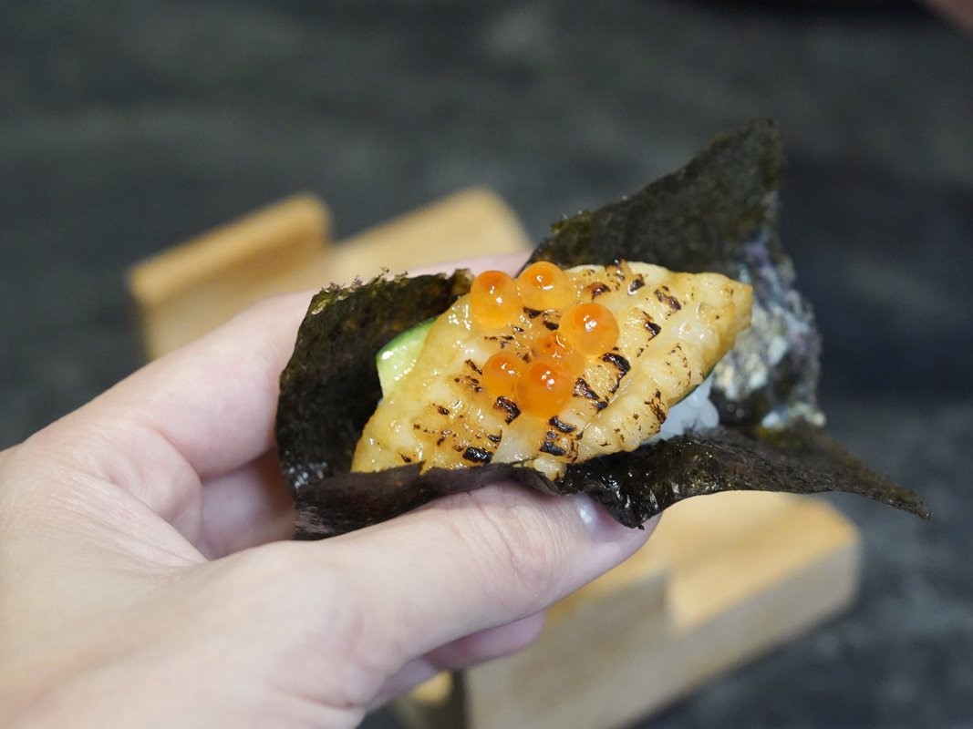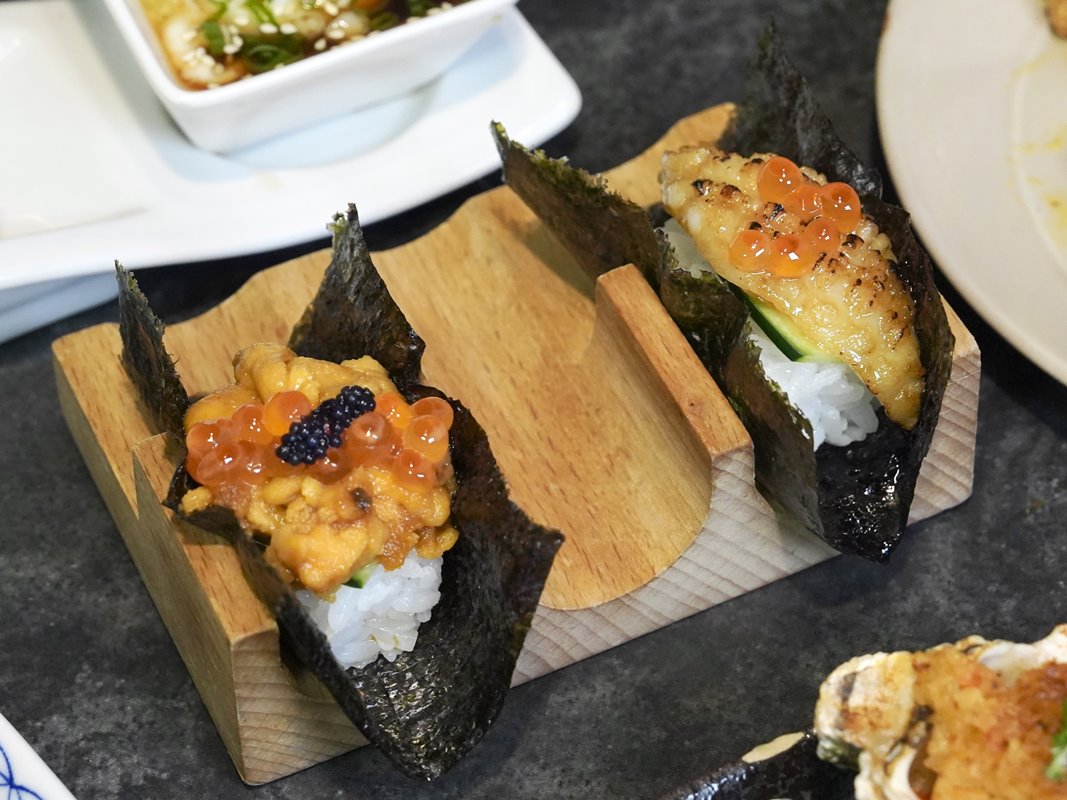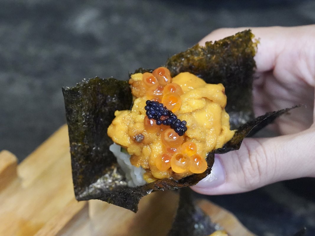 海膽手捲還點綴上魚子醬和鮭魚卵,鮮味十足。