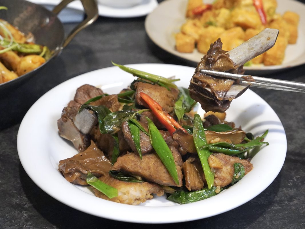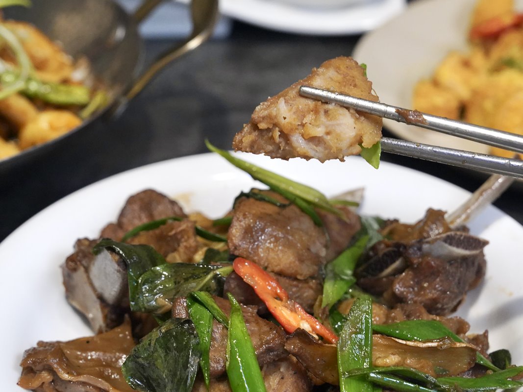 愛吃羊肉的也很推這道!炒過的羊排骨,羊肉很軟嫩可以輕鬆去骨,單吃就很好吃,也可以搭配蔥段一起享用。