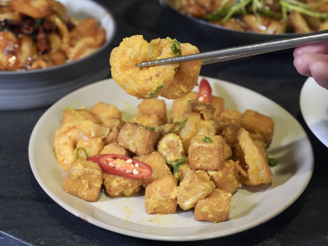 金沙蝦仁豆腐可以一次吃到很嫩的豆腐和蝦仁,鹹蛋黃裹滿外層,香氣十足根本白飯殺手,好吃又不油膩。