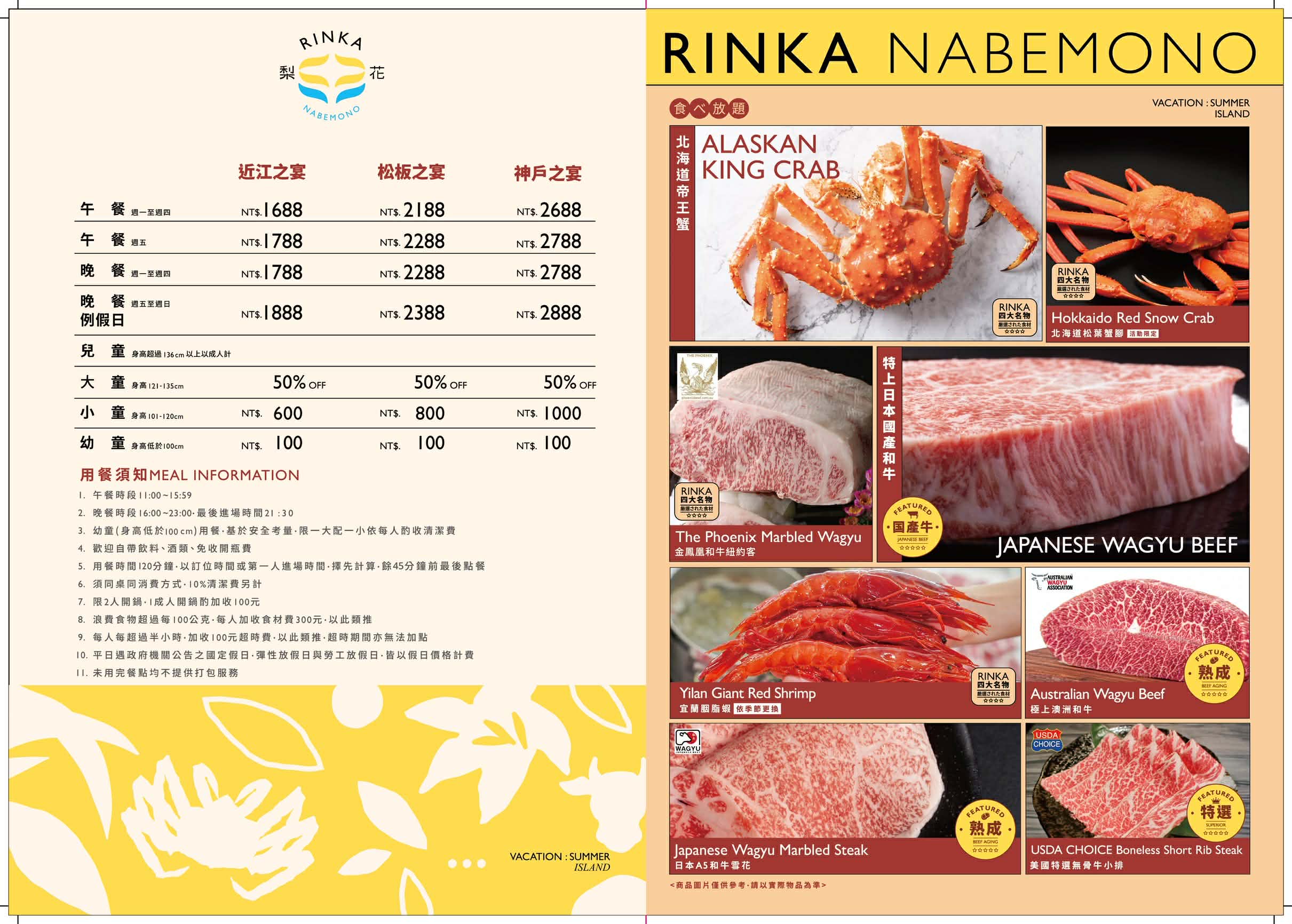 【神戶之宴】北海道帝王蟹、日本A5和牛肋眼、日本A5和牛霜降、日本A5和牛雪花、特上日本國產和牛、美國特選無骨牛小排、宜蘭胭脂蝦,再加上松板之宴與近江之宴等81種品項。