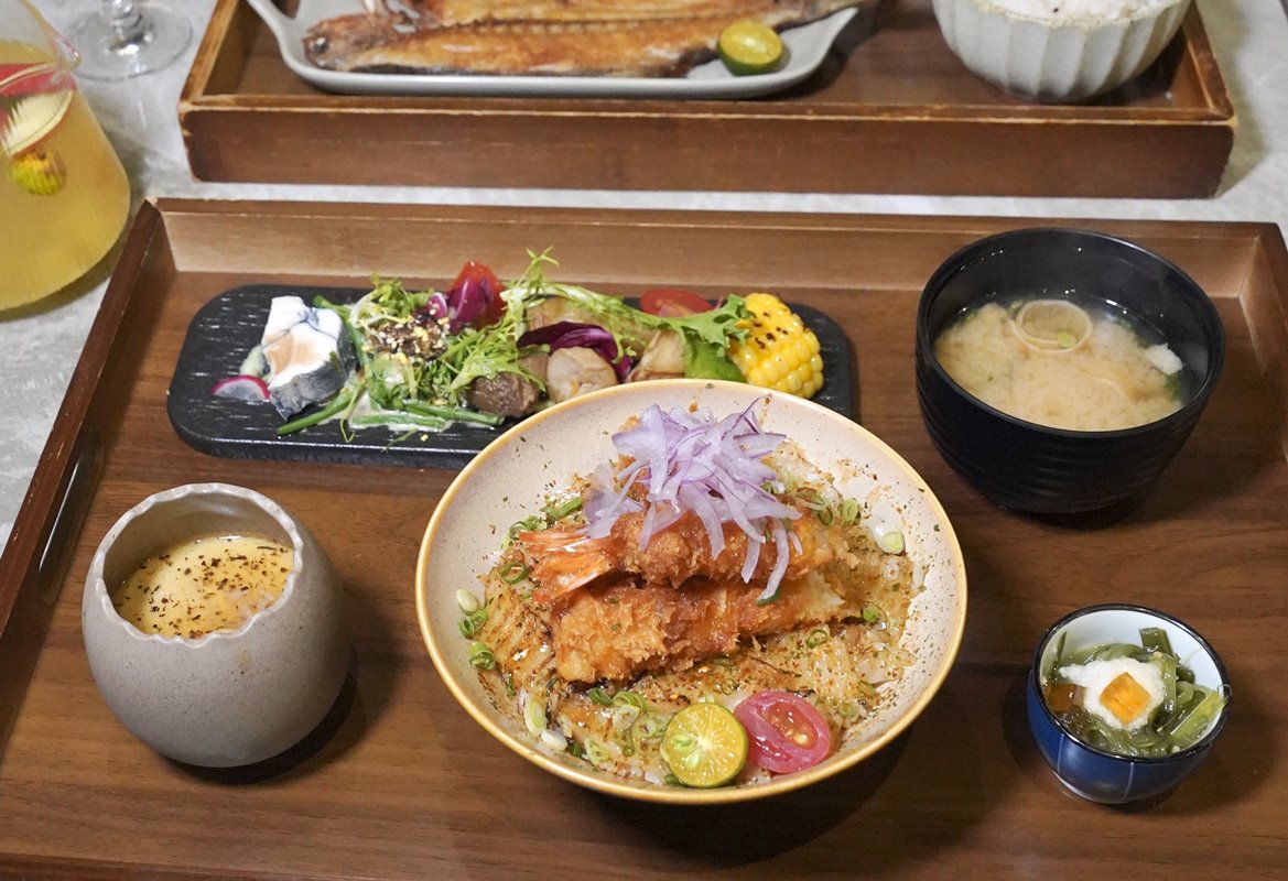 炙燒比目魚天丼可以吃到比目魚+炸蝦,定食搭配小菜、沙拉、味噌湯、茶碗蒸。