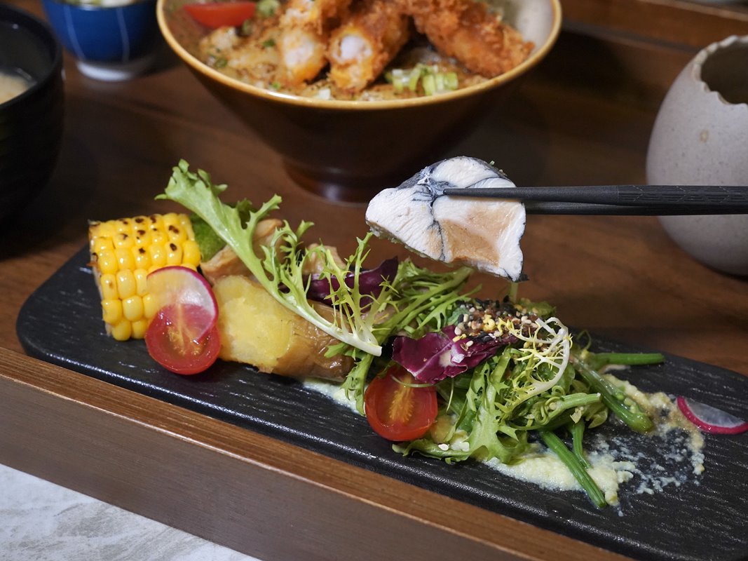 沙拉有搭配裂紋雞捲,外層是竹炭粉,雞肉口感軟嫩,搭配的蔬菜顏色很繽紛。