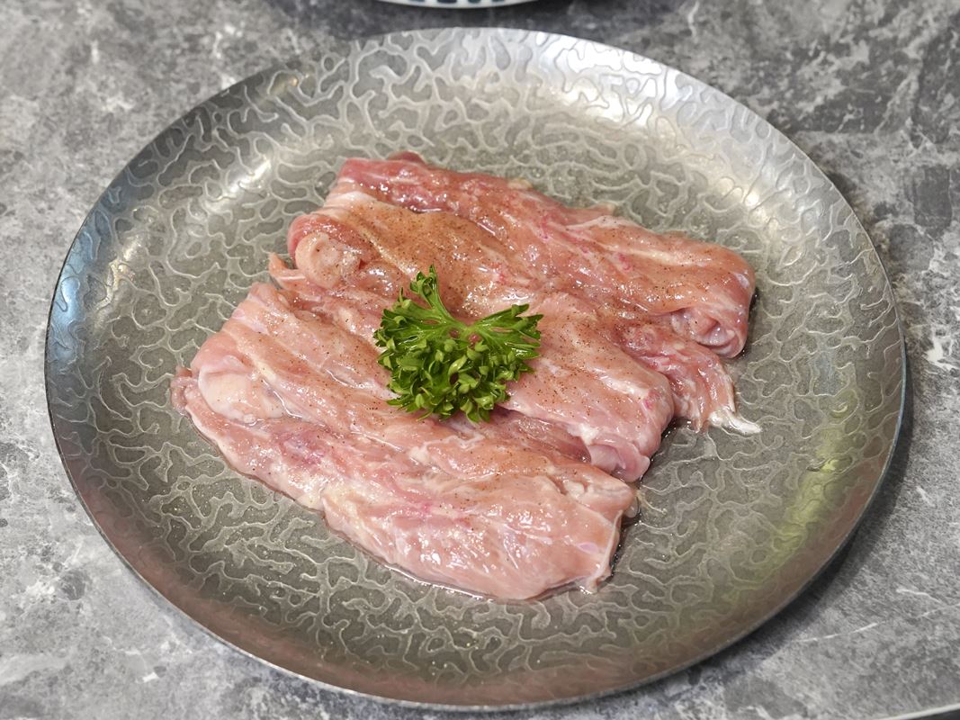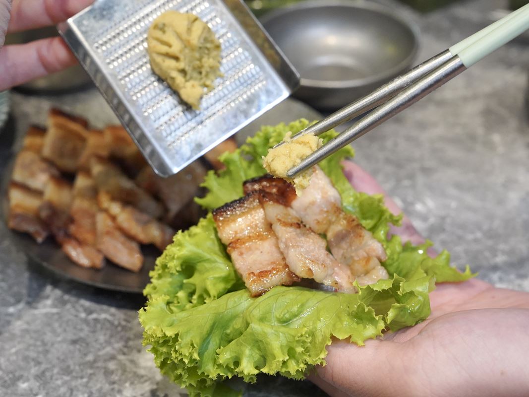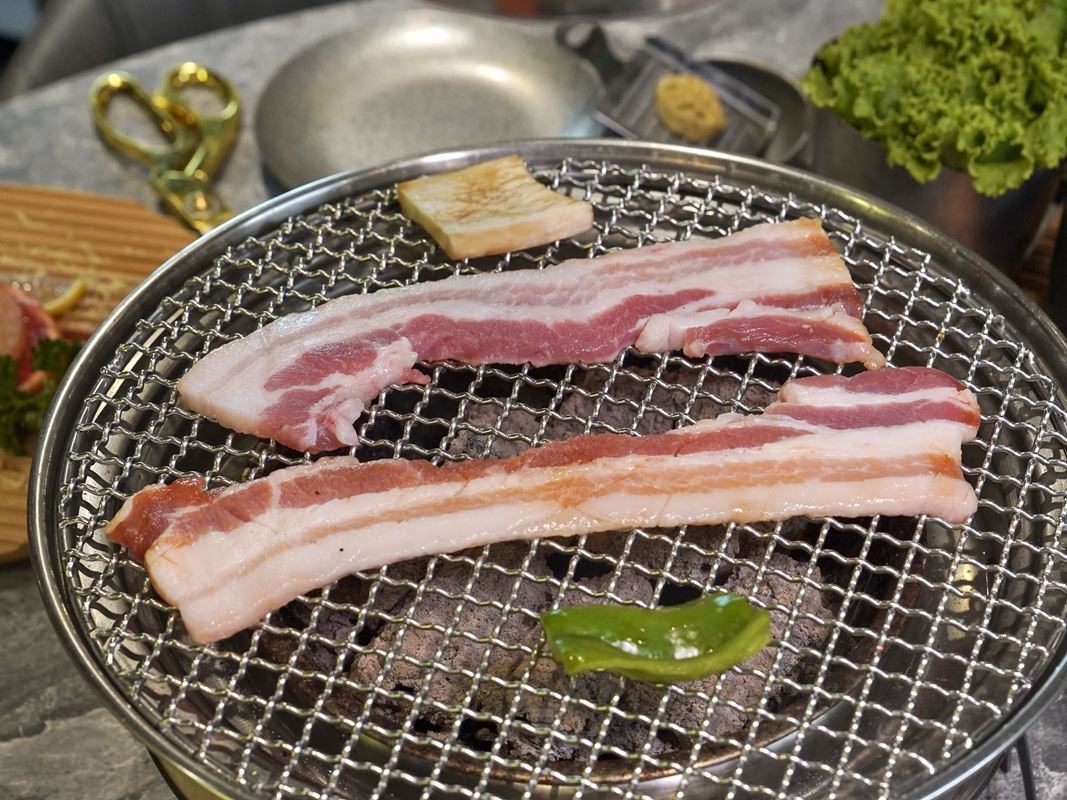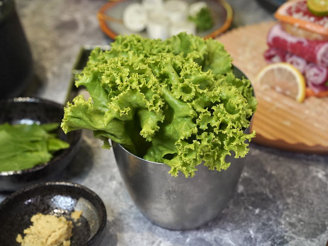 會附贈一盆生菜,推薦搭配豬五花享用,可以中和五花肉的油脂。