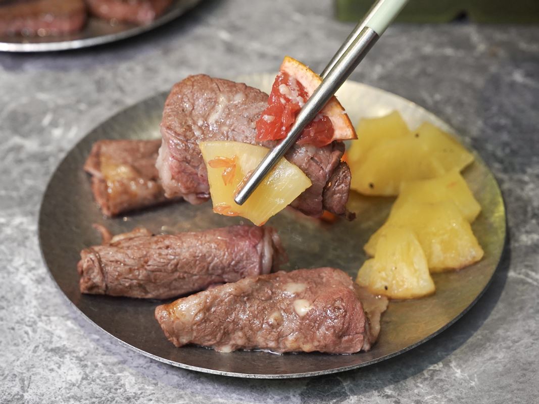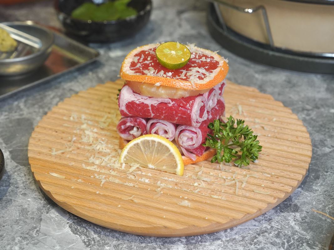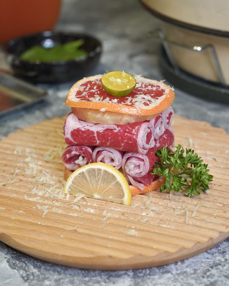 安格斯牛加上芝士多了股起司奶香,搭配烤過的葡萄柚多了果香。如果不喜歡果皮口感也可以先去除果皮。