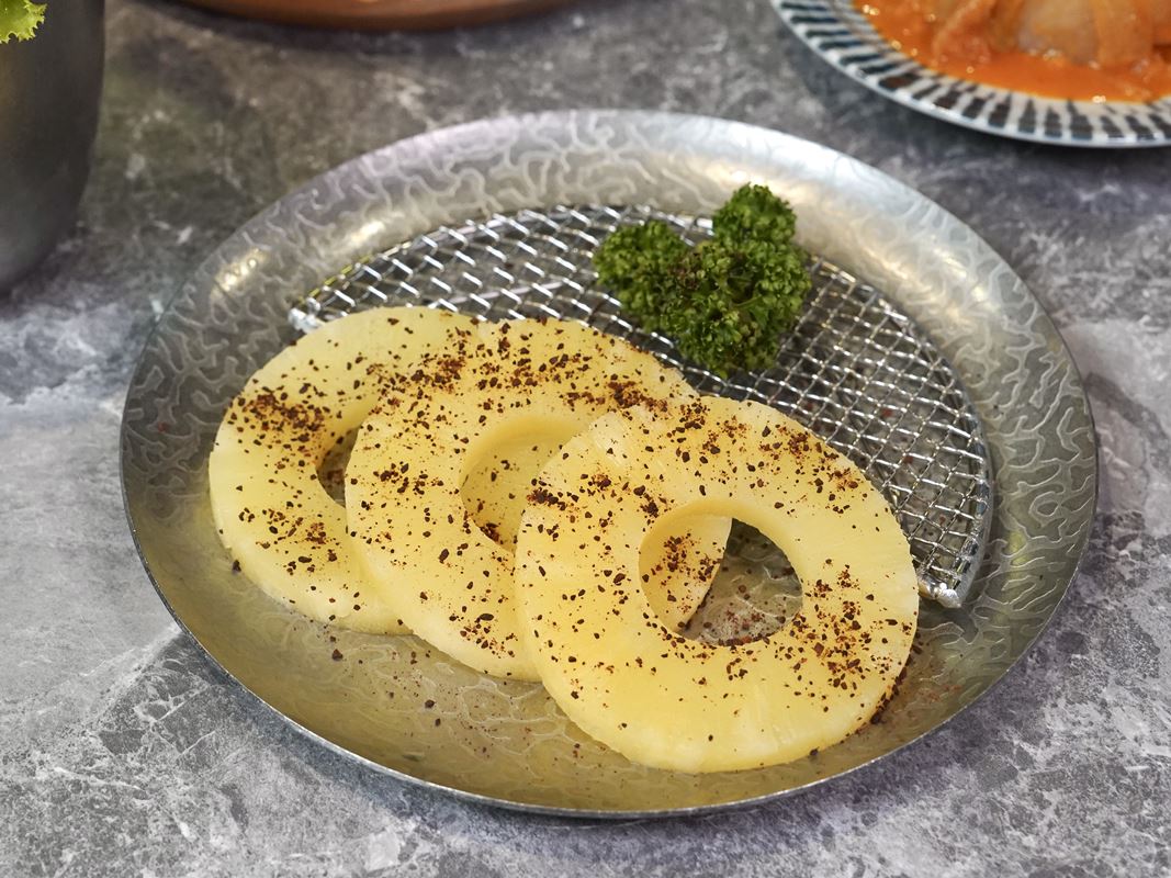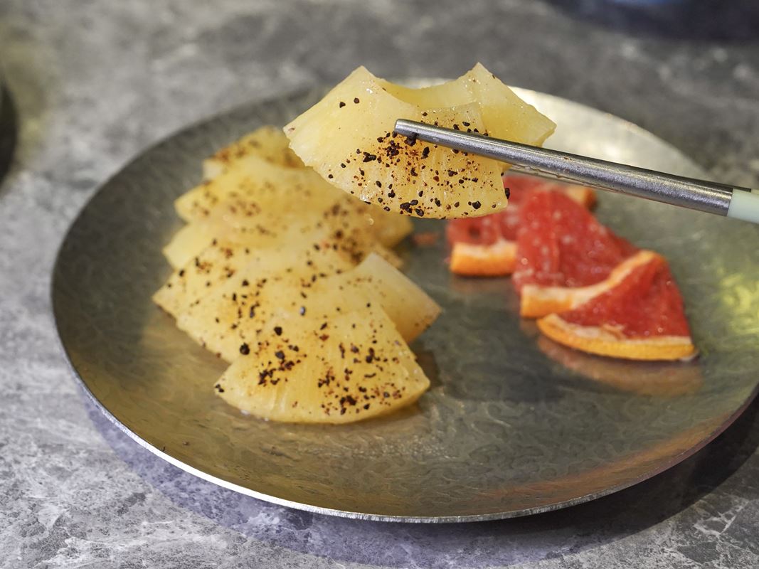 甜點竟然有烤鳳梨片!撒上少許咖啡粉,炙烤過後咖啡香氣和鳳梨很融合,咖啡香和水果甜味意外很搭。