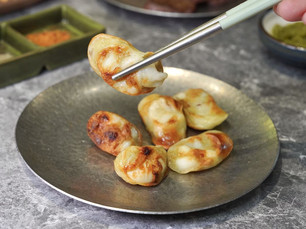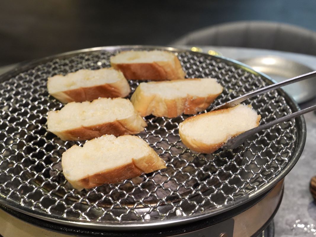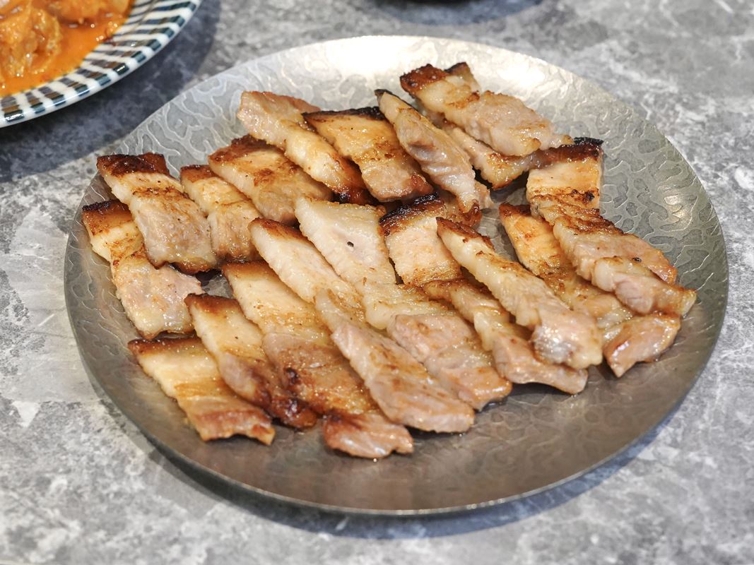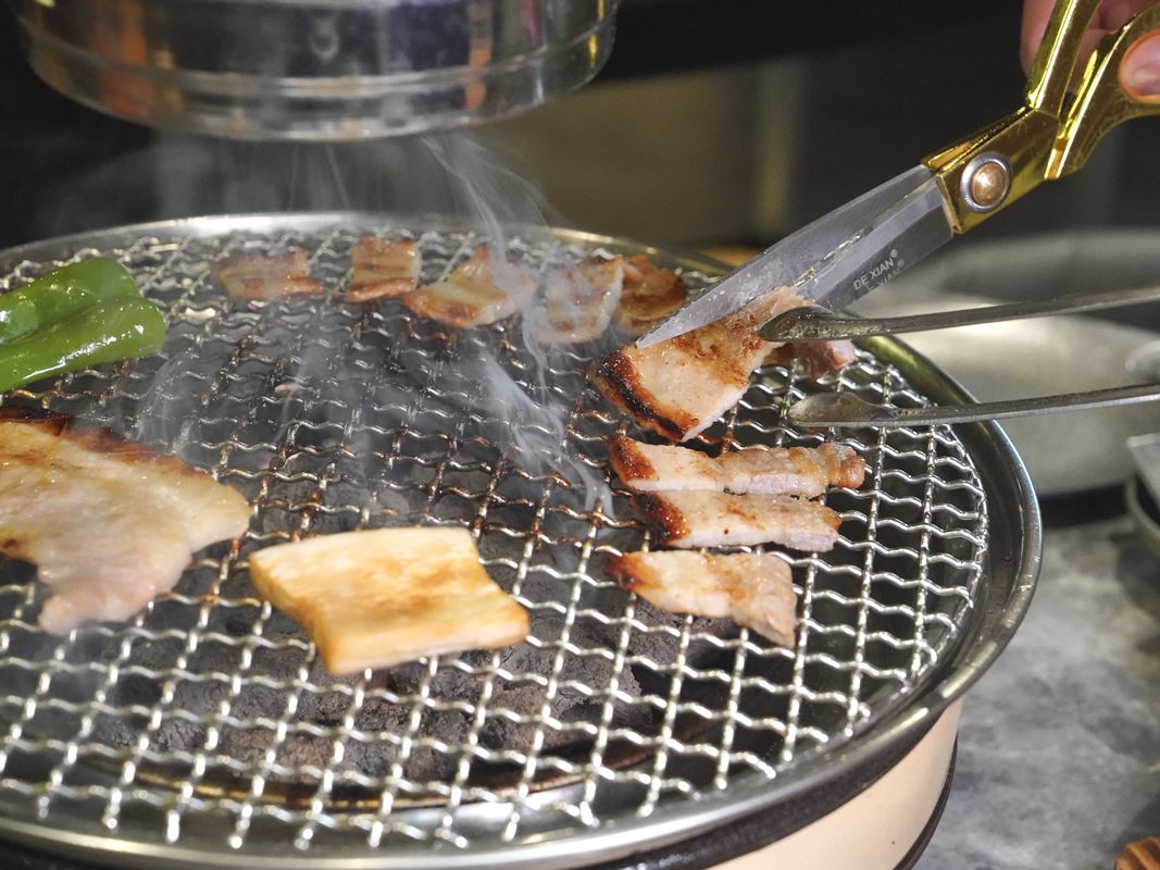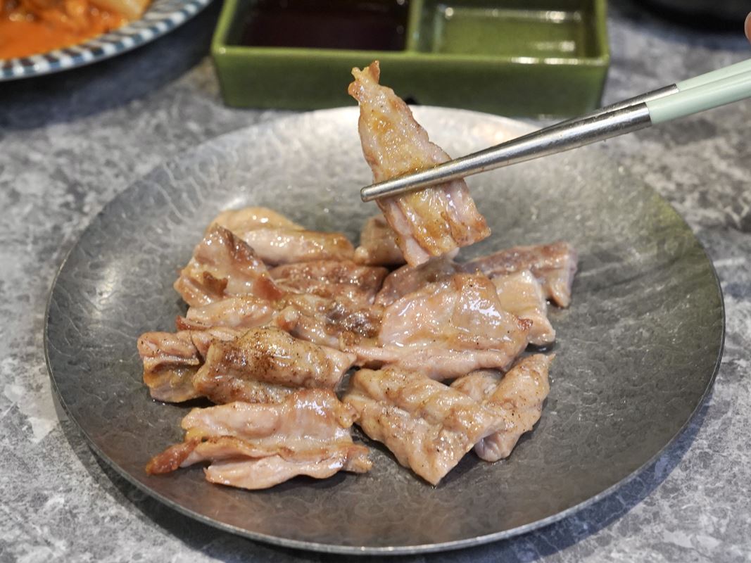 把豬五花的油脂烤到帶有脆度,剪切成小塊入口。