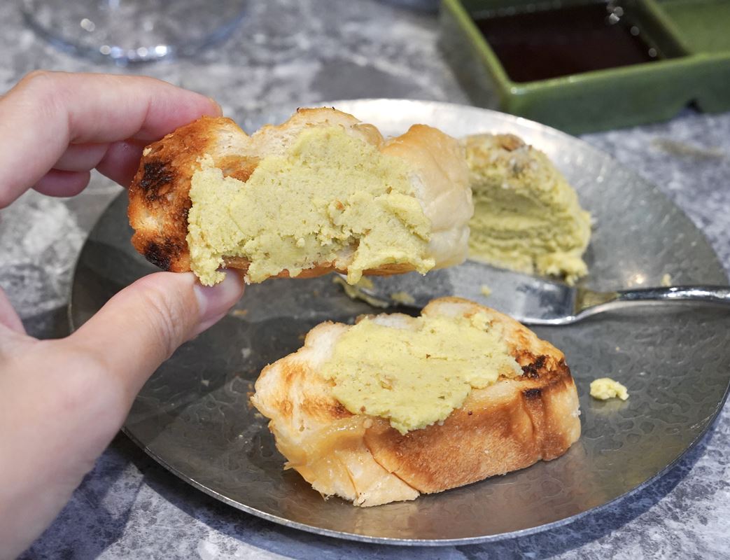 抹香蜜酥是帶有抹茶香氣的奶酥醬,加在烤過的麵包上很涮嘴。